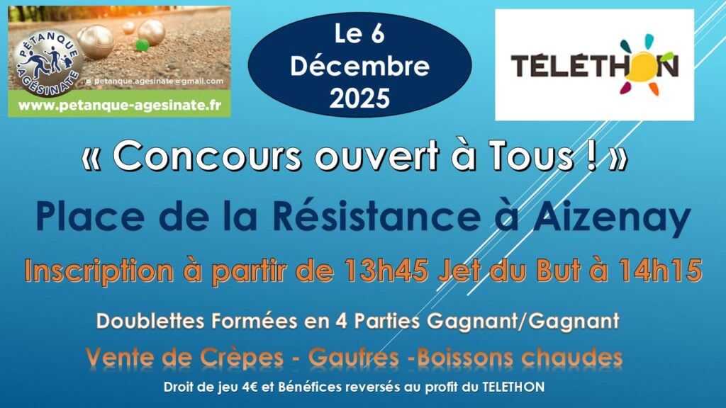 TELETHON 2025 Auteur/autrice de la publication :contact@petanque-agesinate.fr Post published:8 novembre 2025 Post category:ACTUALITES Post comments:0 commentaire Vous devriez également aimer SOIREE BENEVOLES 5 décembre 2022 TROPHEE GUY HOQUET 24 août 2023 NOTE FFPPJ : DOPAGE ET TRAITEMENT 26 mars 2025 Laisser un commentaire Annuler la réponseCommentEnter your name or username to comment Enter your email address to comment Enter your website URL (optional) Enregistrer mon nom, mon e-mail et mon site dans le navigateur pour mon prochain commentaire. Δ